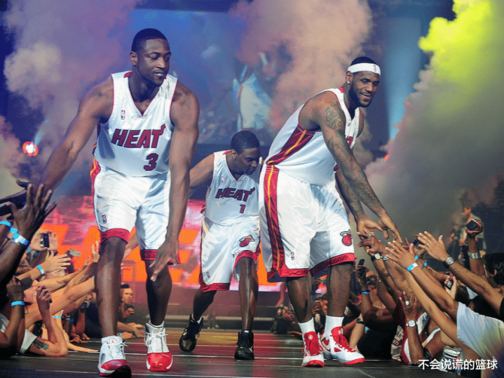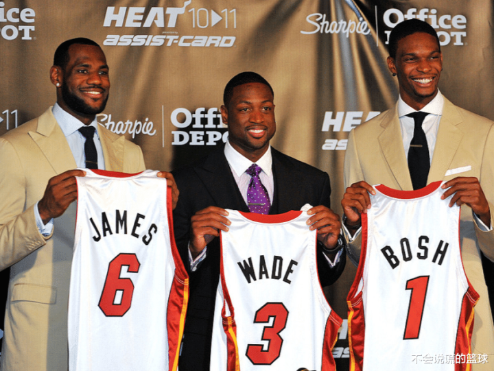 与韦德、波什聚首迈阿密,三位03黄金一代的顶级球星,以一种前所未有的大胆方式,组成了令全联盟胆寒的“三巨头”。